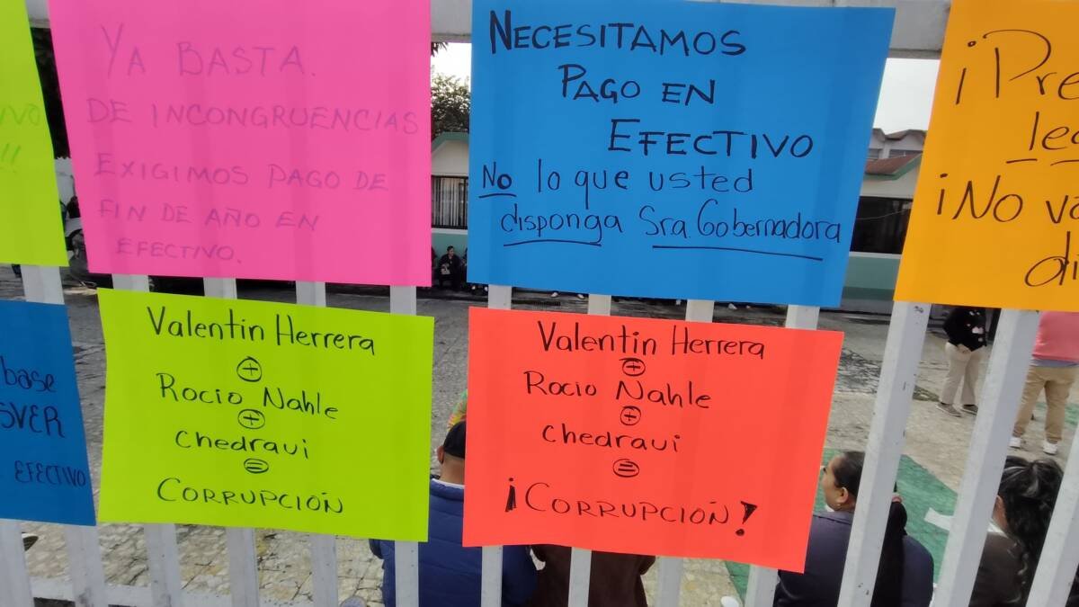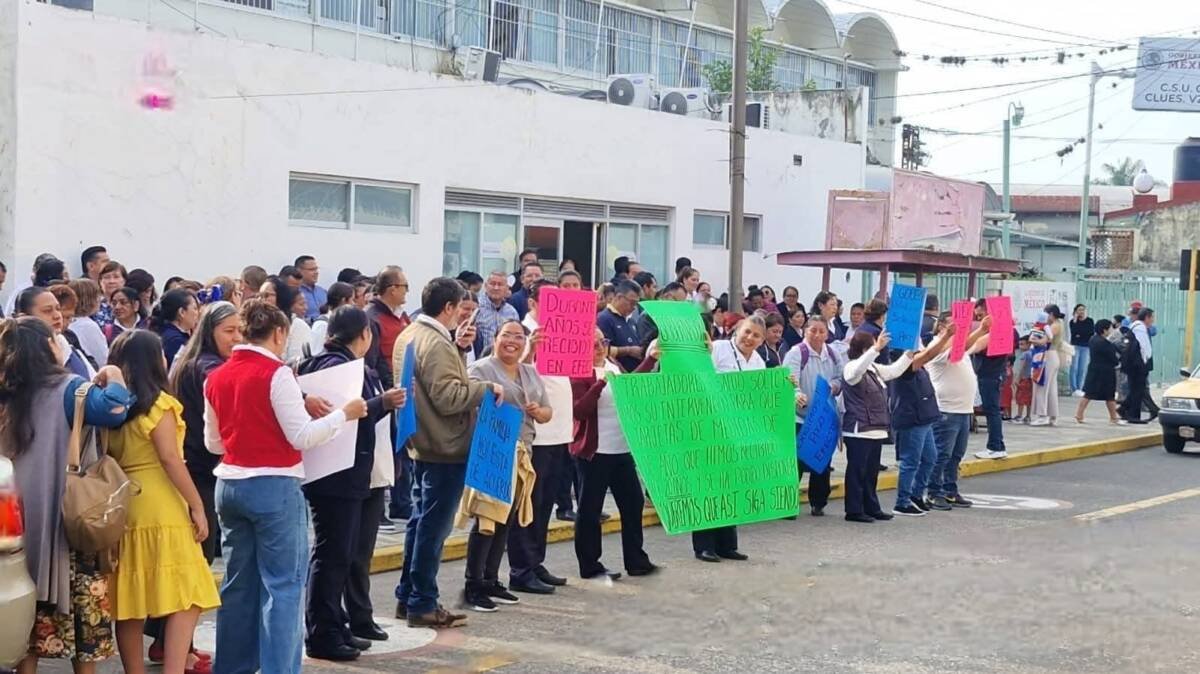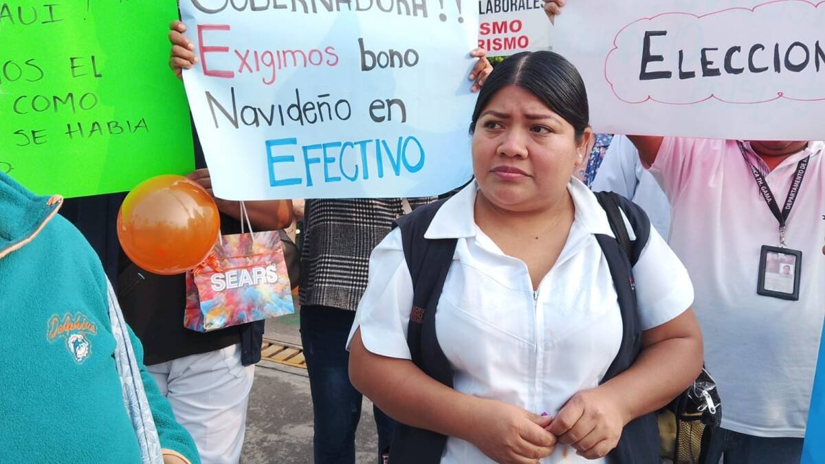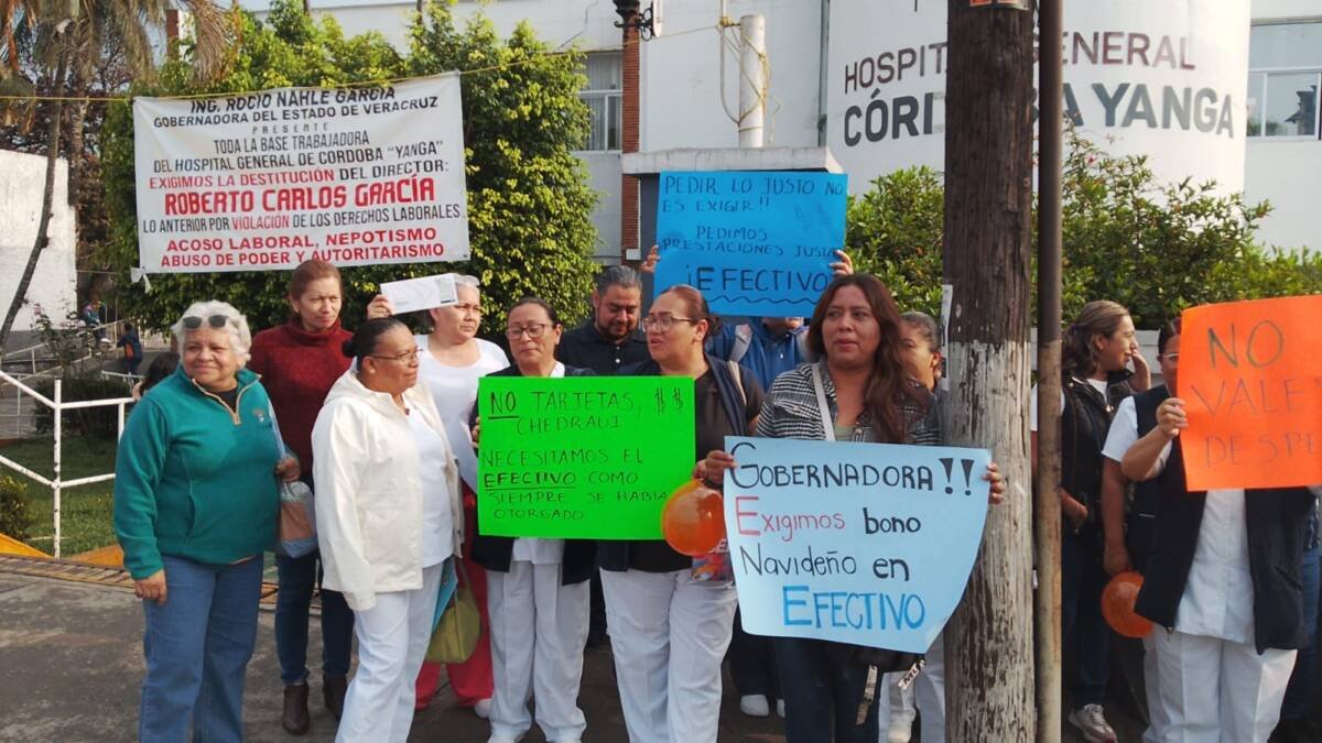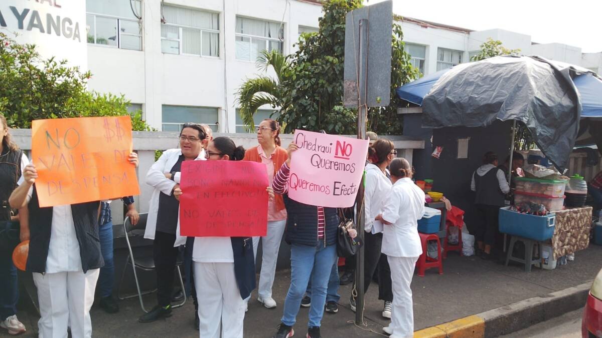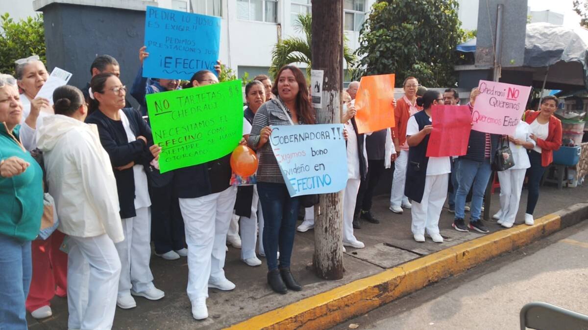 Durante la manifestación, los empleados, entre los que se encuentran enfermeros, personal administrativo, trabajadores sociales, químicos y camilleros, corearon consignas como “¡Efectivo, efectivo, efectivo!” y “¡Rocío Nahle, escúchanos!”, dirigiéndose a la gobernadora del estado.