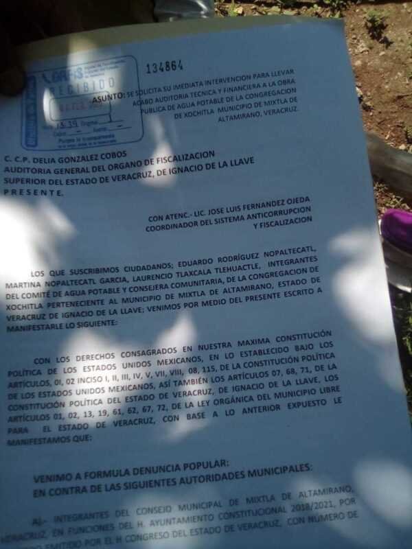 A través de un oficio, los integrantes del Comité de Obra, Eduardo Rodríguez Nopaltecatl, Laurencio Tlaxcala y Martina Nopaltecatl García, denunciaron que existe un mal manejo de los recursos y la responsabilidad que tiene la citada constructora que no ha cumplido con la terminación de la introducción de agua en Xochitla.