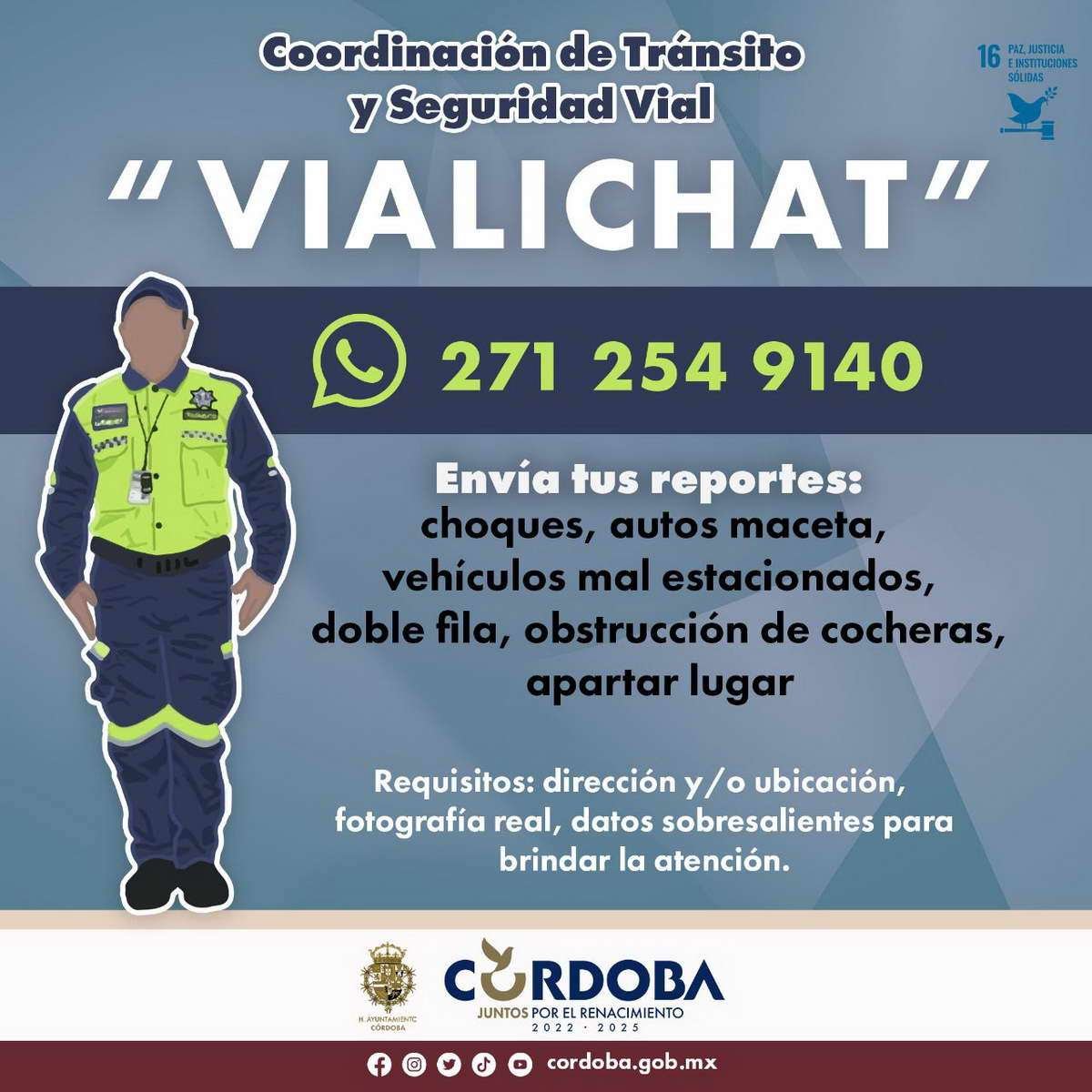 Córdoba, Ver., (12 de noviembre de 2022).- La Dirección de Protección Ciudadana y Movilidad pone a disposición de la ciudadanía el “Vialichat”, donde podrán reportar al número 271-254-9140 choques, autos maceta, vehículos mal estacionados y todo lo relacionado a Tránsito y Seguridad Vial de Córdoba.