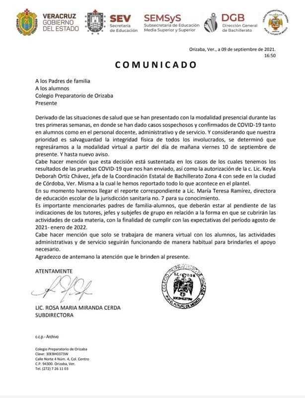 “Cabe hacer mención que esta decisión está sustentada en los casos de los cuales tenemos resultado de las pruebas COVID-19 que nos han enviado, así como la autorización de la c. Lic. Keula Deborah Ortiz Chávez, jefa de la Coordinación Estatal de Bachillerato Zona 4, con sede en la ciudad de Córdoba, Ver. Misma a la cual le hemos reportado todo lo que acontece en el plantel”, se expone en el aviso.