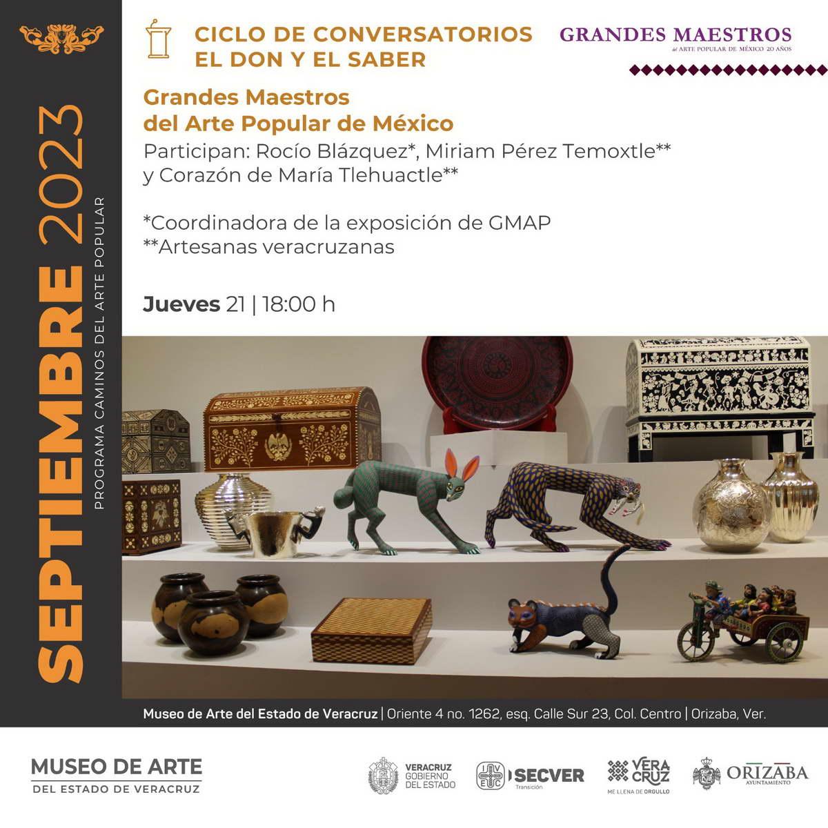 Orizaba, Ver.- El Instituto Veracruzano de la Cultura, a través del Museo de Arte del Estado de Veracruz (MAEV), continúa con el ciclo de conversatorios El don y el saber, actividad que se realizará el próximo jueves en torno a la exposición Grandes Maestros del Arte Popular de México, 20 años, colección de Fomento Cultural Citibanamex, informó la encargada del Museo, Isis Varinia Castro Ramos.