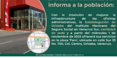 3 Informa IMSS Veracruz Sur cambio de sede de Subdelegación de Orizaba Con la intención de mejorar la infraestructura de las oficinas administrativas, la Subdelegación de Orizaba del Instituto ... Redacción8 de octubre del 2023 Principal