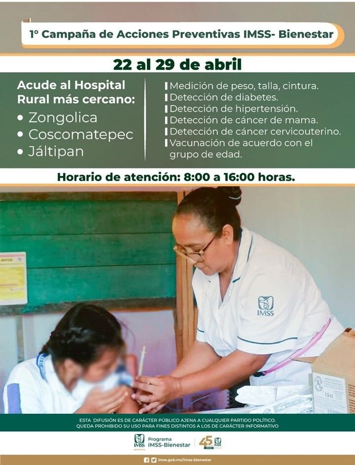 El Programa IMSS-Bienestar y el Instituto Mexicano del Seguro Social (IMSS) en Veracruz Sur realizarán la Primera Campaña de Acciones Preventivas en los Hospitales ubicados en Zongolica, Coscomatepec y Jáltipan con la finalidad de acercar los servicios a la población en situación vulnerable.