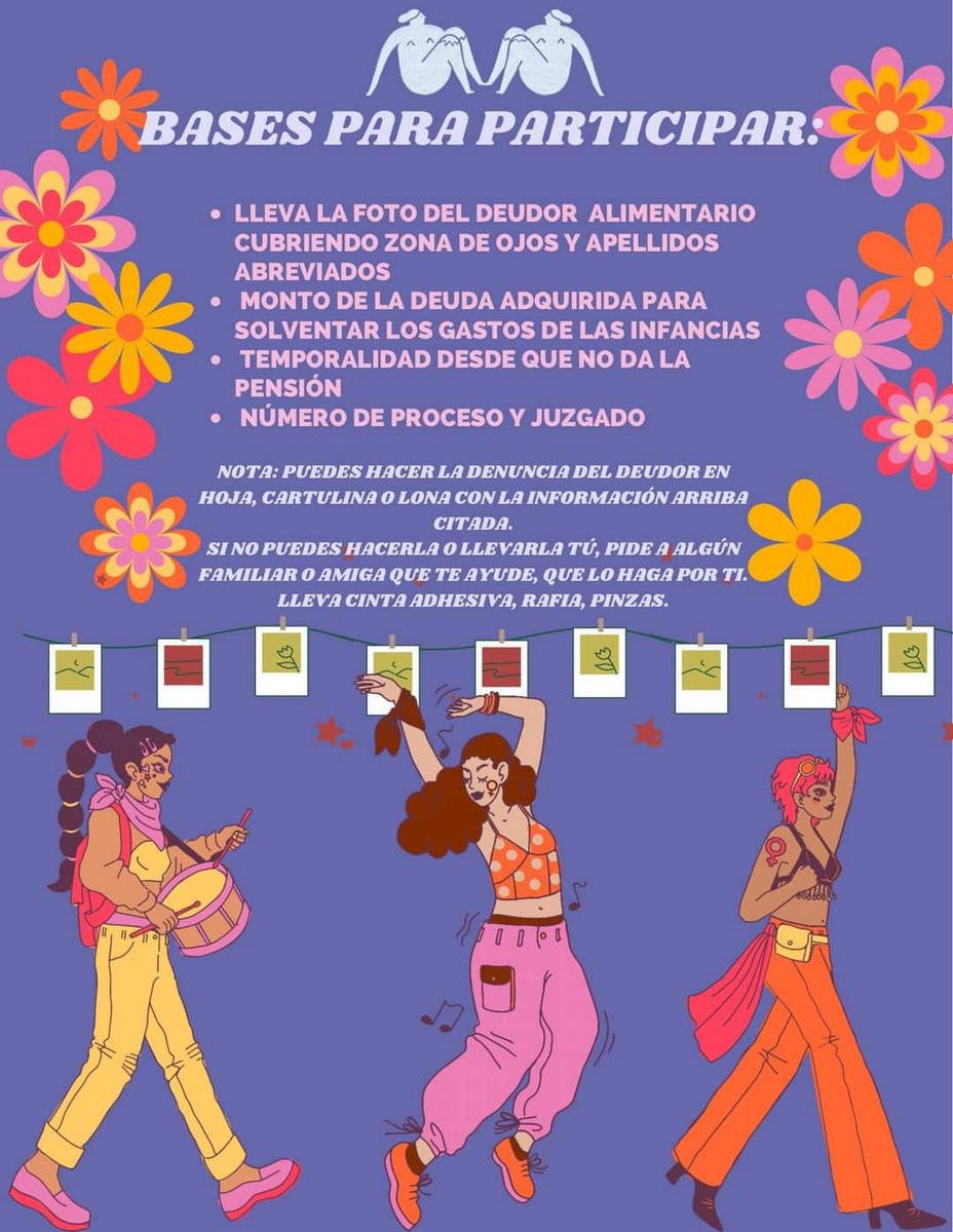 Finalmente detalló que las interesadas deben llevar su cartel con una foto del deudor alimentario cubriendo zona de ojos y los apellidos abreviados, el monto de la deuda adquirida para solventar los gastos de las infancias, la temporalidad desde que no da la pensión y el número de proceso del juzgado, lo cual puede ser a través de una hoja, una cartulina o lona con información.