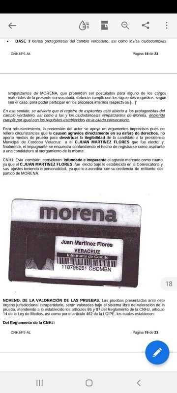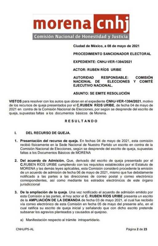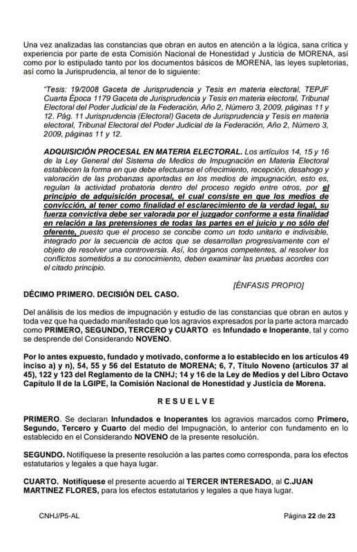 En su impugnación, Expediente CNHJ-VER-1394/2021, Rubén Ríos Uribe “se apoya en argumentos imprecisos pues no refiere circunstancias que le causen agravios directamente en su esfera de derechos. No aporta medios de prueba para desvirtuar la ilegibilidad de la candidatura a la presidencia municipal de Córdoba, Veracruz a el C. Juan Martínez Flores que fue electo”, destaca en su resolución la Comisión Nacional de Honestidad y Justicia de Morena que preside Ema Eloísa Vivanco Esquide.