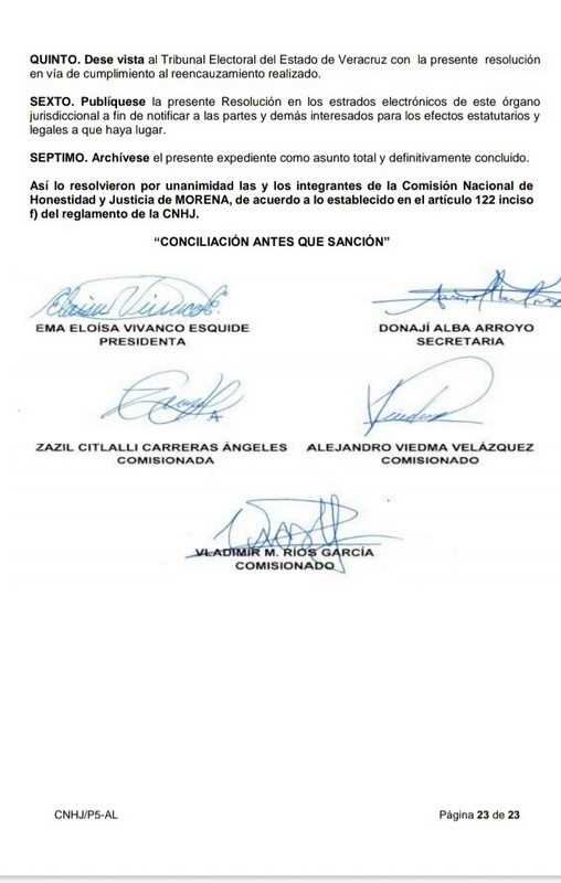 En definitiva, la CNHJ DE Morena declaró infundados e inoperantes los agravios denunciados por Rubén Ríos Uribe y dio vista al Tribunal Electoral de Veracruz de su resolución para los efectos legales correspondientes.