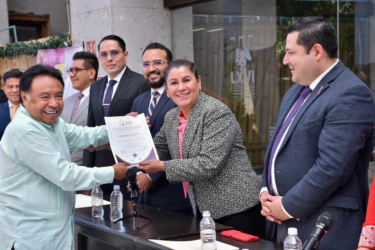 Córdoba, Ver. 26 de enero de 2024.- El presidente Juan Martínez Flores recibió el Distintivo Ayuntamiento Transparente Edición 2023, otorgado por el Instituto Veracruzano de Acceso a la Información y Protección de Datos Personales (IVAI), durante la comparecencia del comisionado presidente, David Agustín Jiménez Rojas, en la sala oval del Congreso del Estado en la ciudad de Xalapa.
