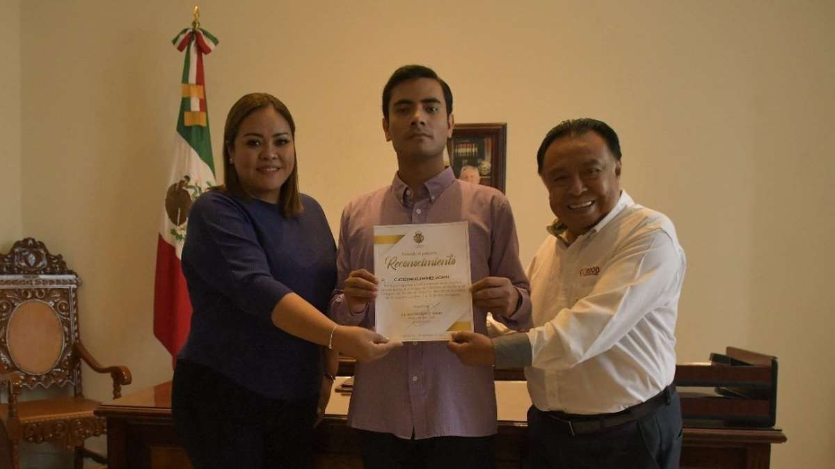Córdoba, Ver., (23 de septiembre de 2022). – El Presidente Municipal, Juan Martínez Flores, realizó la entrega de un reconocimiento al agrónomo, José Emilio Jiménez Jacinto, por su participación en el XVII Parlamento de la Juventud 2022, organizado por el Instituto Veracruzano de la Juventud (IVJ) en el Congreso del Estado de Veracruz, representando a Córdoba con su propuesta: “Biorremediación del Suelo contra el Cambio Climático”.