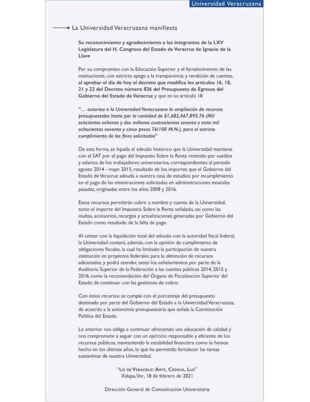 La UV celebró que el Congreso del Estado autorizó la solicitud para liquidar el adeudo histórico que la Universidad mantenía con el Sistema de Administración Tributaria, por el pago del ISR de sueldos y salarios de trabajadores, correspondientes a los ejercicios 2014 y 2015.