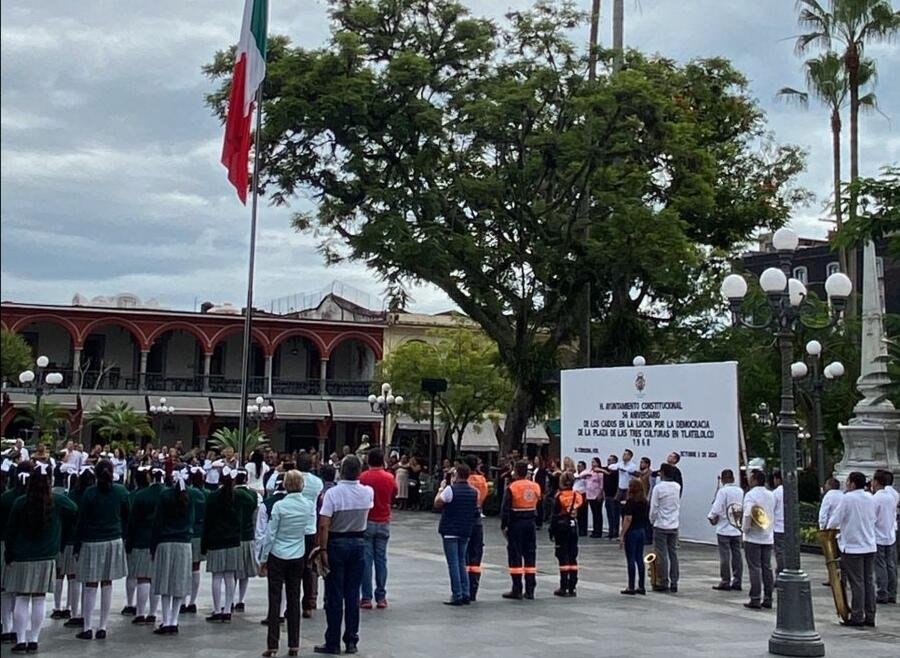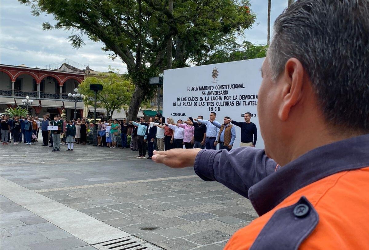 Córdoba, Ver.- 02/10/2024.- El presidente Juan Martínez, la síndica Vania López González y ediles que conforman el Ayuntamiento Córdoba Veracruz llevan el acto cívico con motivo del 56 aniversario de los caídos en la lucha por la democracia de la plaza de las 3 culturas en Tlatelolco.