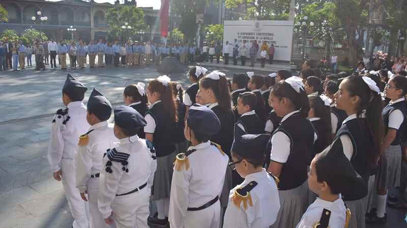 El acto cívico celebrado en la explanada del parque 21 de Mayo, estuvo a cargo de profesores y alumnos de la Escuela Primaria de la Universidad del Golfo de México UGMEX, quienes a través de su escolta portaron el lábaro patrio, que fue izado a media asta, por el regidor sexto Alfredo Riverón Mora.