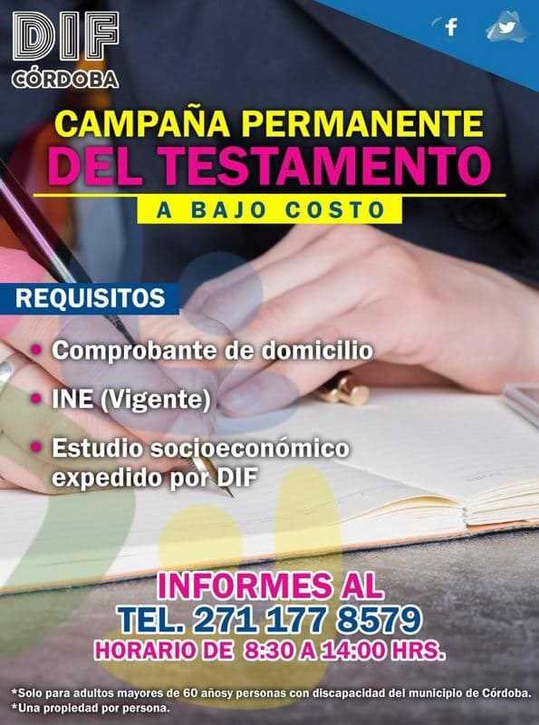 Córdoba, Ver.- Con la finalidad de dar legalidad y seguridad jurídica a las familias cordobesas después de la perdida de algún familiar, el Sistema Municipal para el Desarrollo Integral de la Familia (SMDIF) recuerda a toda la población sobre su Campaña Permanente del Testamento a Bajo Costo.