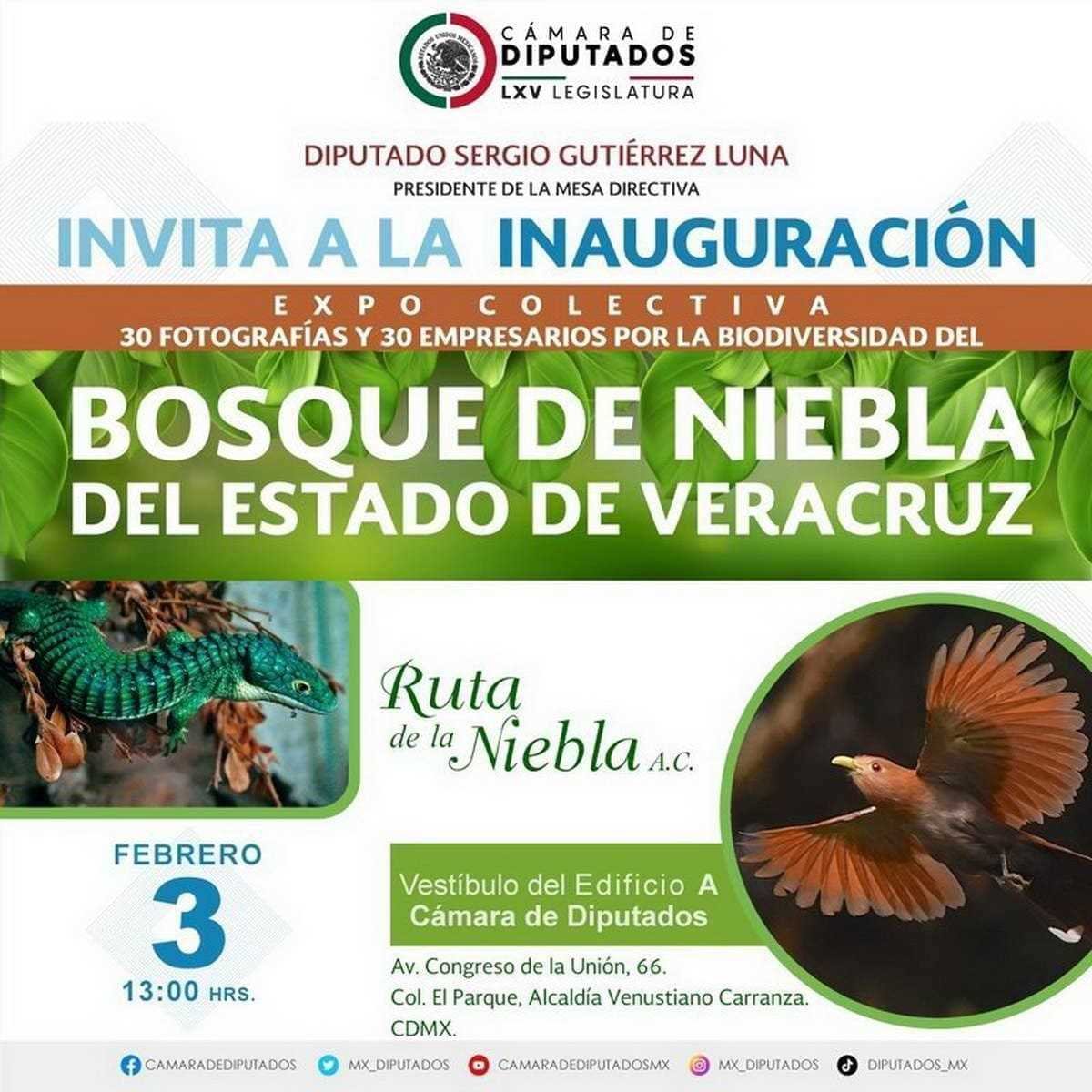 Este jueves 3 de febrero, a las 13:00 horas, el legislador veracruzano realizará la inauguración de la Expo Colectiva “Treinta Fotografías y 30 empresarios por la Biodiversidad del bosque de Niebla del Estado de Veracruz” en el vestíbulo del Edificio A de la Cámara de Diputados.