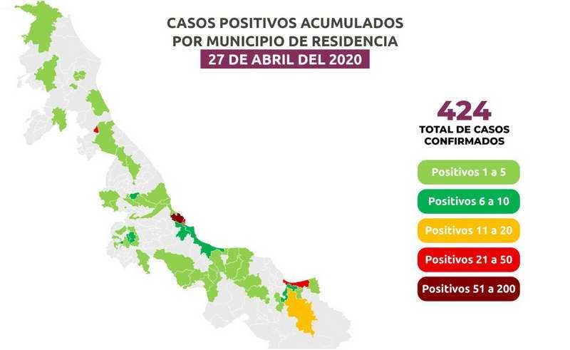 La cifra de positivos es 424 en 61 demarcaciones: Veracruz 159, Coatzacoalcos 46, Boca del Río 41, Poza Rica 32, Minatitlán 12, Orizaba y Xalapa 10, Alvarado 7; Córdoba, Cosoleacaque, Fortín y Medellín 6; Martínez de la Torre 5; Amatlán de los Reyes, Cosamaloapan, Emiliano Zapata y Santiago Tuxtla 4; Ixtaczoquitlán, José Azueta, Tierra Blanca, Tlacotalpan y Tuxpan 3; Acayucan, Cerro Azul, Jáltipan, Misantla, Papantla, Perote, Puente Nacional y San Andrés Tuxtla 2.