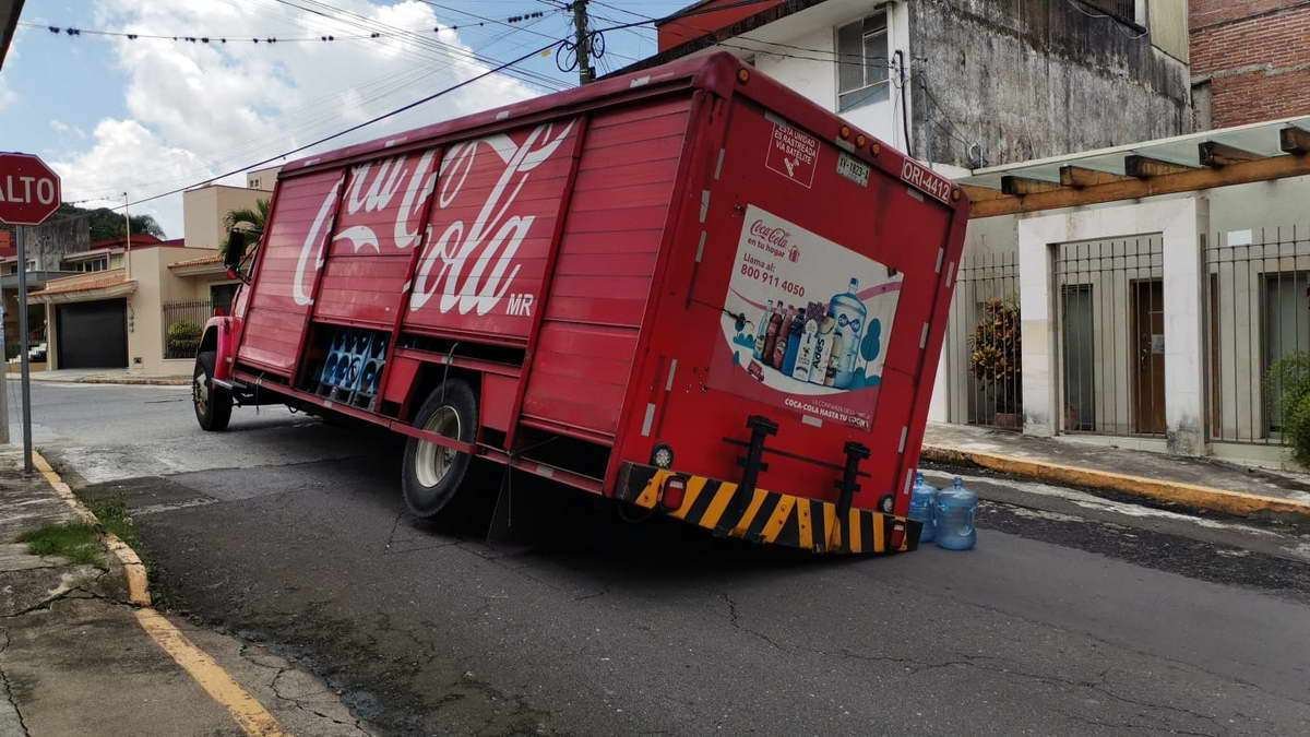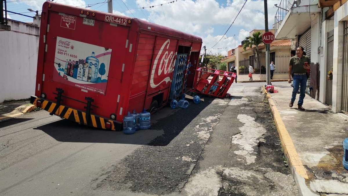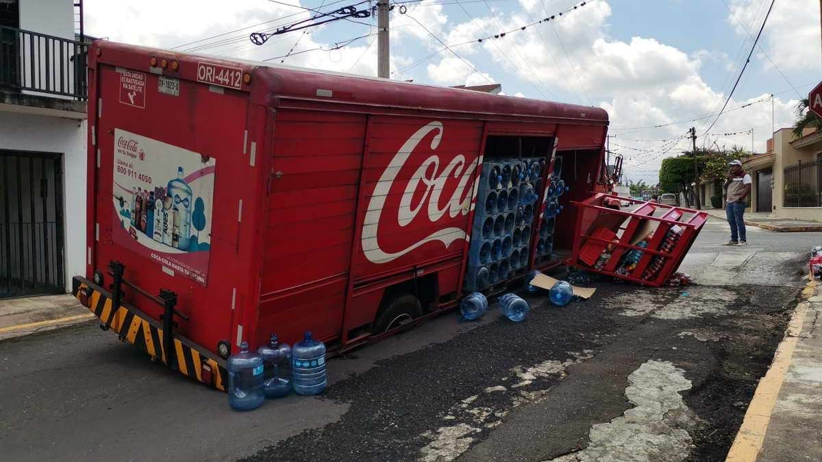 Córdoba, Ver.- Un camión repartidor de refrescos estuvo a punto de volcarse, luego de terminar con la parte trasera hundida dentro de un socavón, al momento de circular sobre la calle 1 entre las avenidas 19 y 21 del fraccionamiento Alameda.
