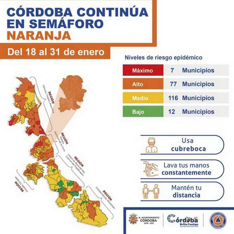 Las acciones preventivas y las medidas sanitarias no se relajarán a pesar de que el municipio permanecerá en color naranja del semáforo epidemiológico del 18 al 31 de enero, anunció Israel Alejandro Lara Gutiérrez, titular de la jefatura de salud del Ayuntamiento de Córdoba.