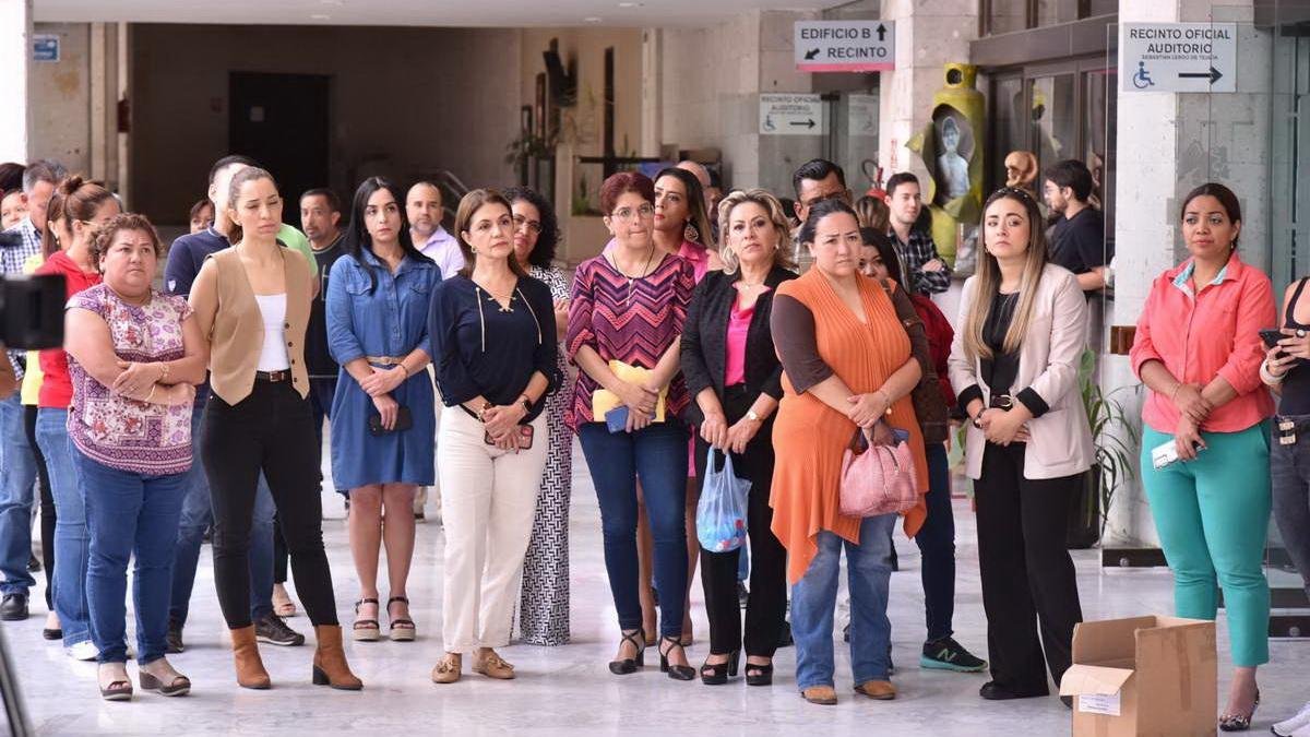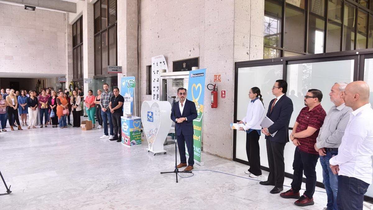 Posteriormente, el legislador Juan Javier Gómez Cazarín y el secretario del Sindicato Único de Trabajadores al Servicio del Poder Legislativo (SUTSPL), José de Jesús Rodríguez Hernández, colocaron en el contenedor las tapas de plástico que llevaban, seguido de las y los empleados que hicieron lo propio.