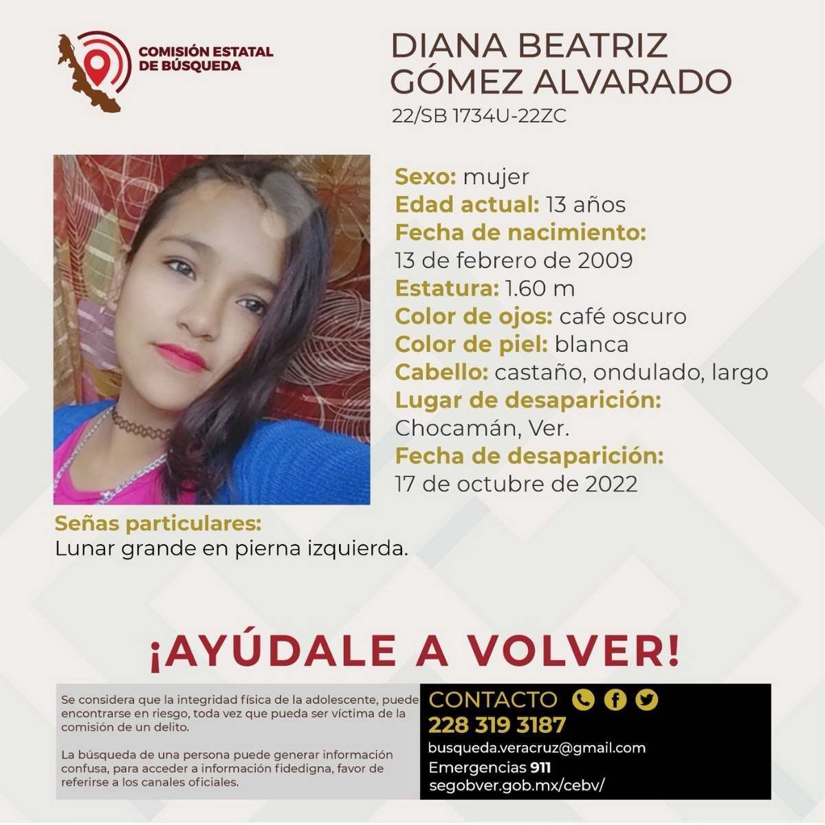 Chocamán, Ver.- A través de la Comisión Estatal de Búsqueda de personas desaparecidas, es reportada como no localizada la pequeña Diana Beatriz Gómez ...