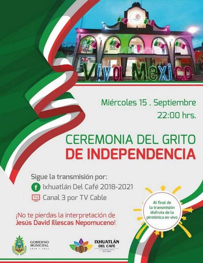 La ceremonia en recuerdo del Grito de Dolores del 15 de septiembre de 1810, dará inicio a partir de las diez de la noche a través del portal de facebook del ayuntamiento “Ixhuatlan Del Café 2018-2021” y por el canal 3 de TvCable Digital, siendo grabado con antelación por segundo año consecutivo debido a las restricciones por la actual pandemia de COVID-19 para que no se realicen eventos multitudinarios ni verbenas populares a fin de evitar contagios.