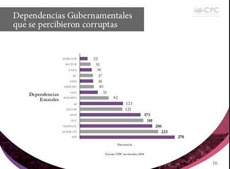 Las dependencias estatales que se perciben con más nivel de corrupción son: Instituto de Pensiones del Estado, Comisión de Agua del Estado de Veracruz, Universidad Popular Autónoma de Veracruz, Instituto de Espacios Educativos de Veracruz, Sistema Estatal para el Desarrollo Integral de la Familia.