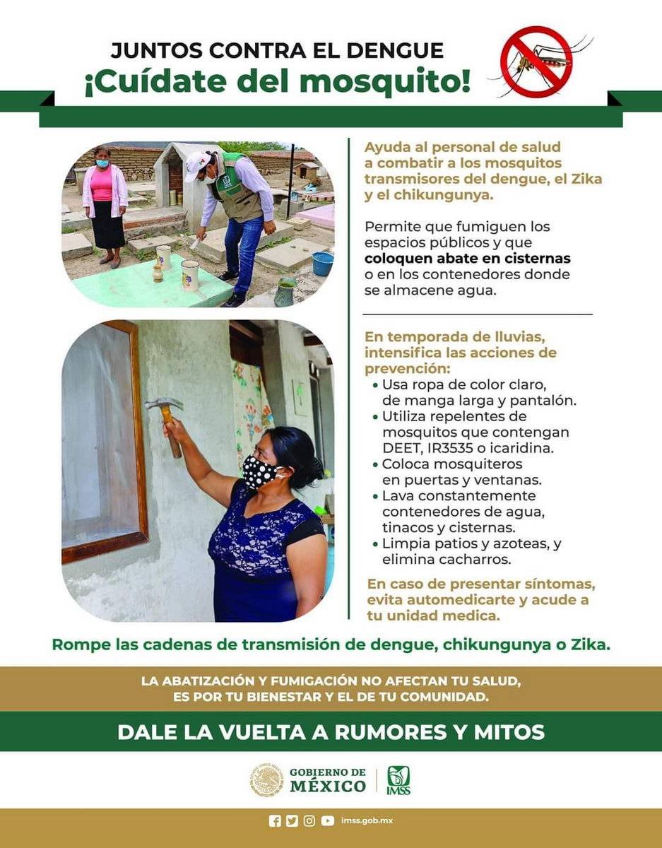 El Instituto Mexicano del Seguro Social (IMSS) en Veracruz Sur informa que durante la temporada de lluvias incrementa la reproducción del mosco Aedes Aegypti y con ello los padecimientos transmitidos, a través de su picadura como el Zika, enfermedad que se caracteriza por fiebre, comezón, conjuntivitis, dolor de cabeza y muscular y sarpullidos.