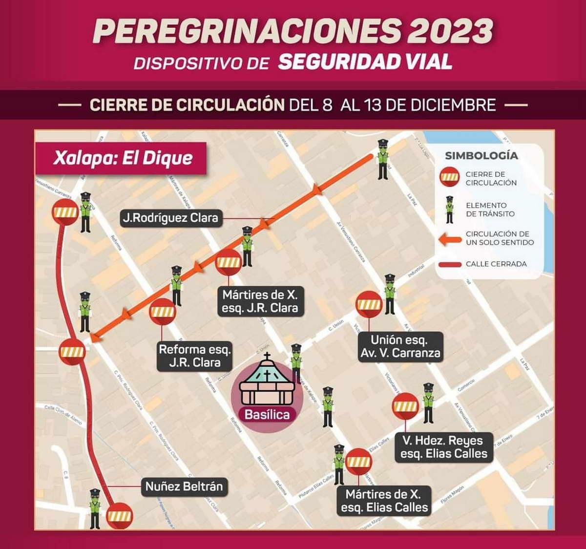 Por lo que estas son las calles que permanecerán cerradas hasta un día después de la conmemoración del Día de la Virgen de Guadalupe: J. Rodríguez Clara, Mártires de Xalapa, Reforma, Unión, Núñez Beltrán, Elías Calles y V. Hernández Reyes.