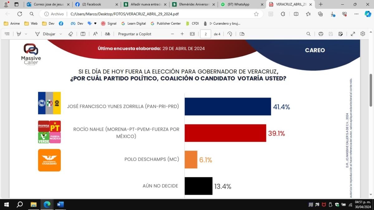 Xalapa, Veracruz, 30 de abril — De acuerdo con el último estudio de intención de voto realizado por Massive Caller el 29 de abril, Pepe Yunes ahora encabeza la carrera por la gubernatura de Veracruz con un 41.4% de la intención de voto. Rocío Nahle sigue con un 39.1%, mientras que Polo Deschamps cuenta con el 6.1%, y un 13.4% de los encuestados aún no decide su voto.