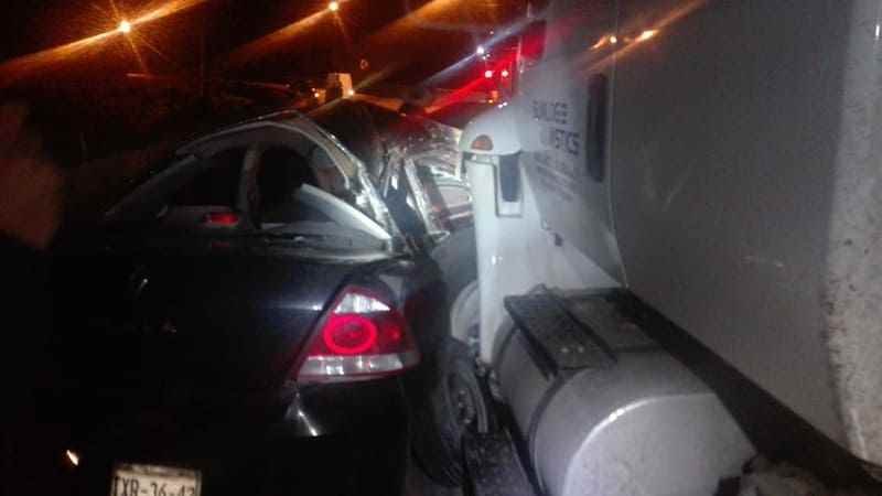 Se presume que al llegar al kilómetro 224, fueron embestidos por un Tracto camión International color blanco con matricula 39-AF-21, mismo que impacto a un automovil Renault Scala color negro con placas TXR-36-42 y una camioneta tipo Van Ford Transit color blanca con matricula SK-18-523.