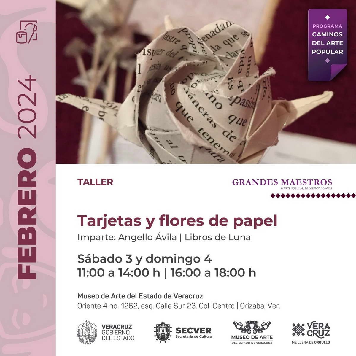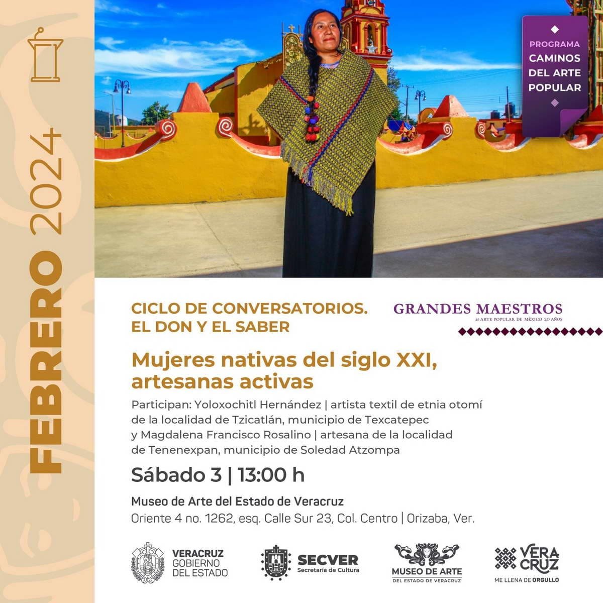 El sábado 3 de febrero en punto de las 13:00 horas será el Ciclo de Conversatorios: El Don y el Saber, Mujeres nativas del siglo XXI, artesanas activas en el que participan: Yoloxóchitl Hernández y Magdalena Francisco , así como de 10:00 a 19:00 horas la Expoventa Artífices Orizaba. Mercado artesanal en el que participan artesanas, artesanos y emprendedores de la región de las Altas montañas de la zona centro de Veracruz”.