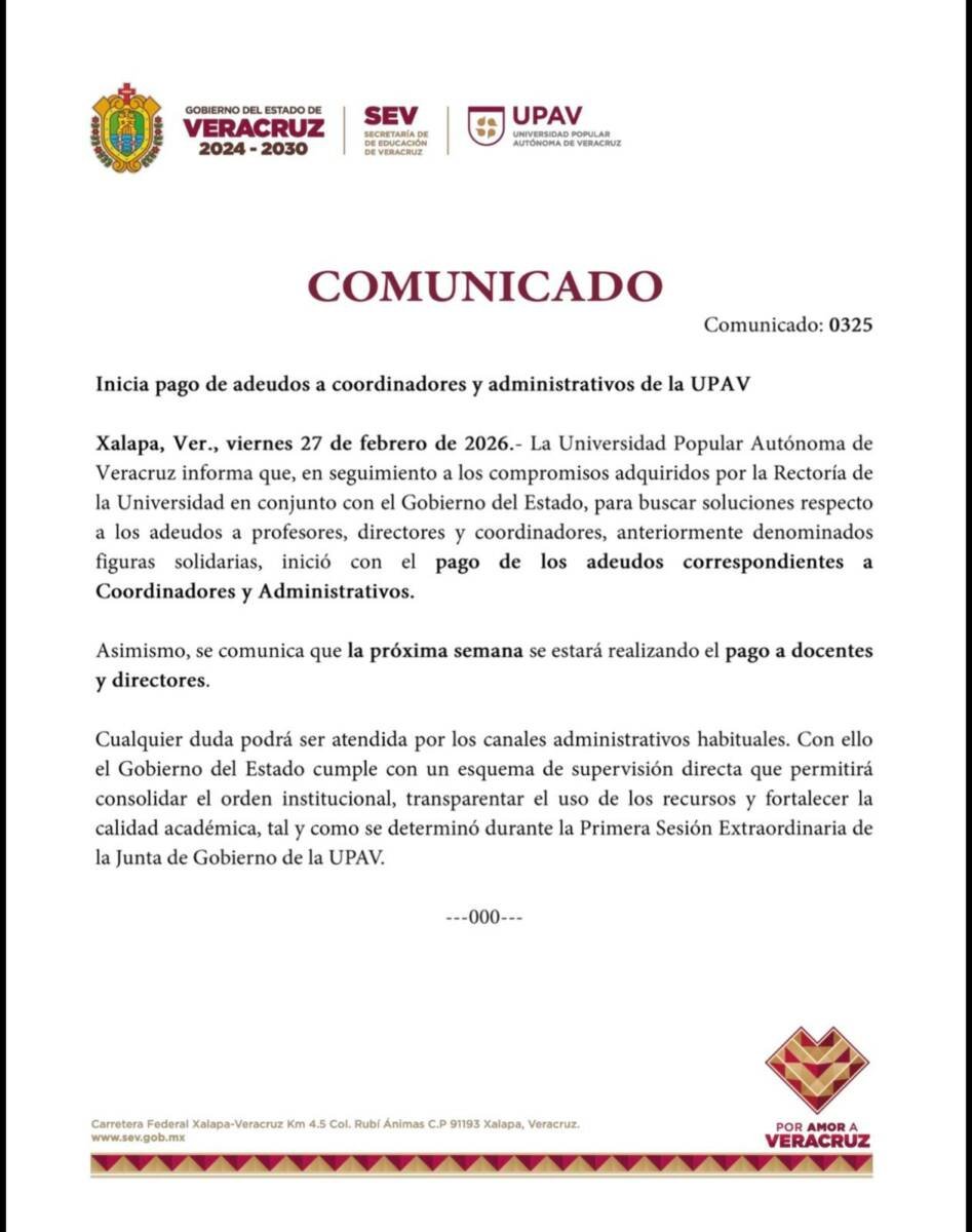 El comunicado de la UPAV fechado el viernes avisa que basada en los compromisos adquiridos entre la rectoria y Gobierno del Estado se inició el pago de los adeudos correspondientes a coordinadores y administrativos.