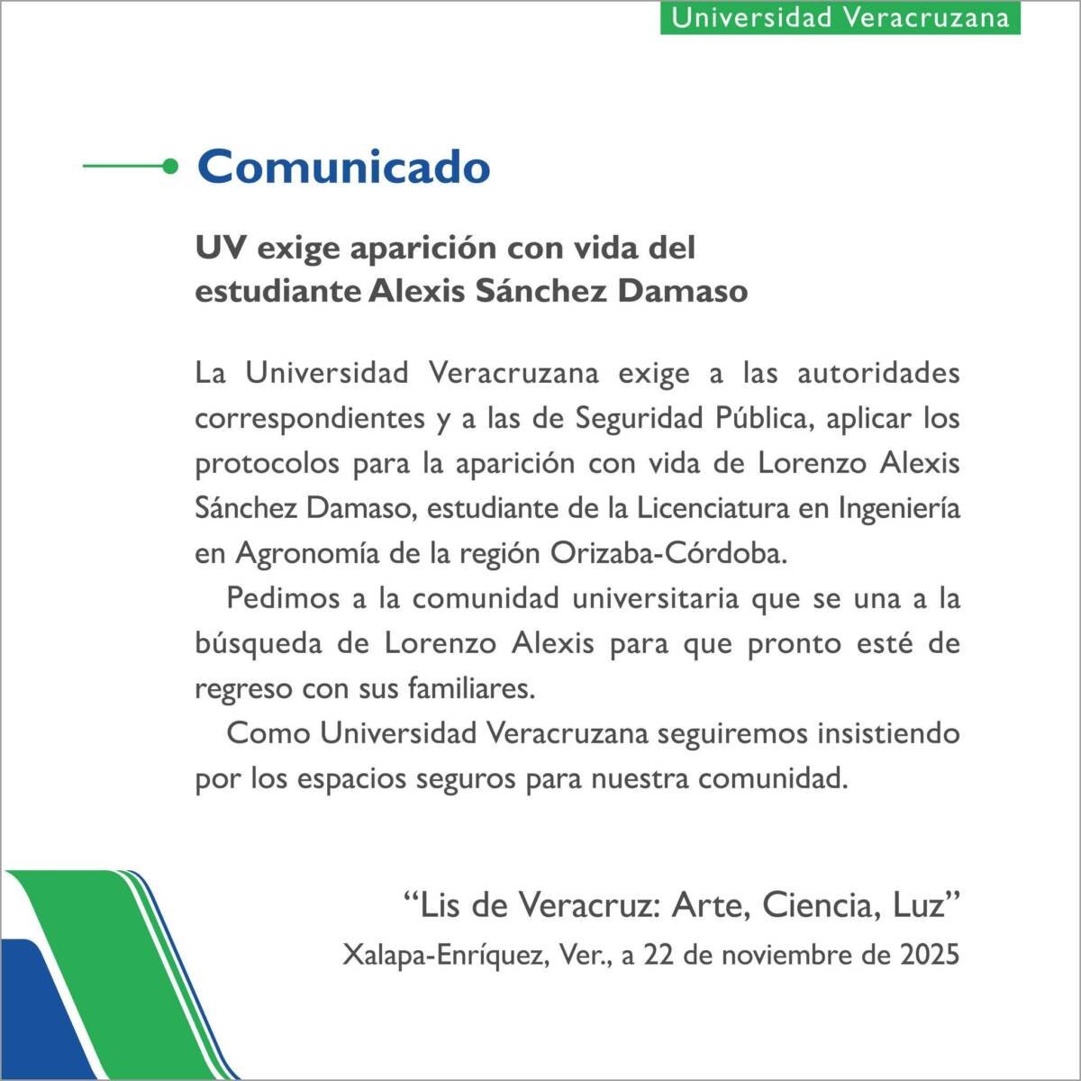 Córdoba, Ver.- La Universidad Veracruzana exigió a las autoridades de Seguridad Pública aplicar los protocolos correspondientes para encontrar a Lorenzo Alexis Sánchez Damaso, estudiante de la Facultad de Agronomía ubicada en la congregación de Peñuela desaparecido en Amatlán de los Reyes el pasado 21 de noviembre.