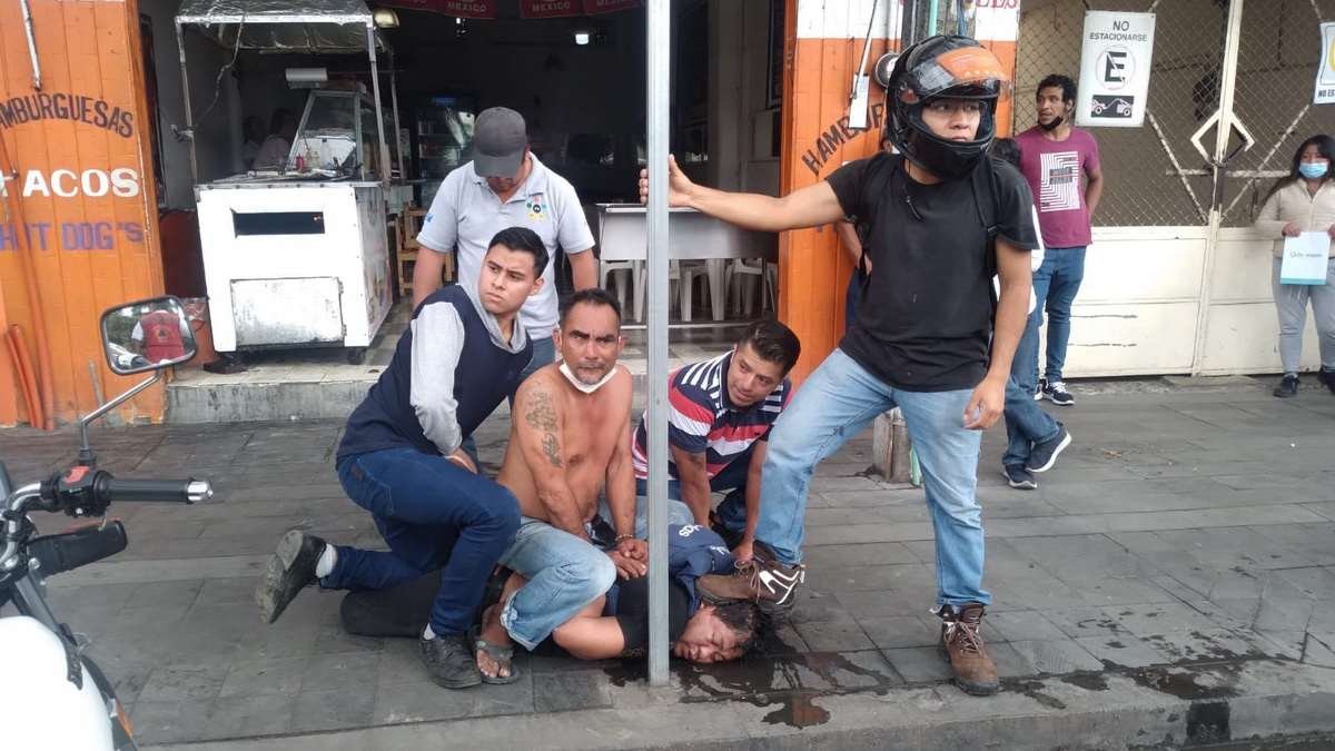 Fortín, Ver.- Un sujeto que pretendió asaltar un local de venta de hamburguesas, además de tratar de robarse una motocicleta, logró ser intervenido por algunos vecinos quienes de inmediato lo sometieron y tras varios minutos de espera, arribó la Fuerza Civil procediendo a su detención y traslado a sus instalaciones ya que sería puesto a disposición de la Fiscalía Regional por los delitos de tentativa de robo.