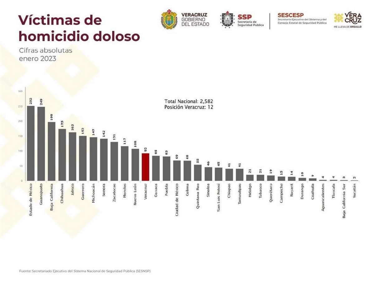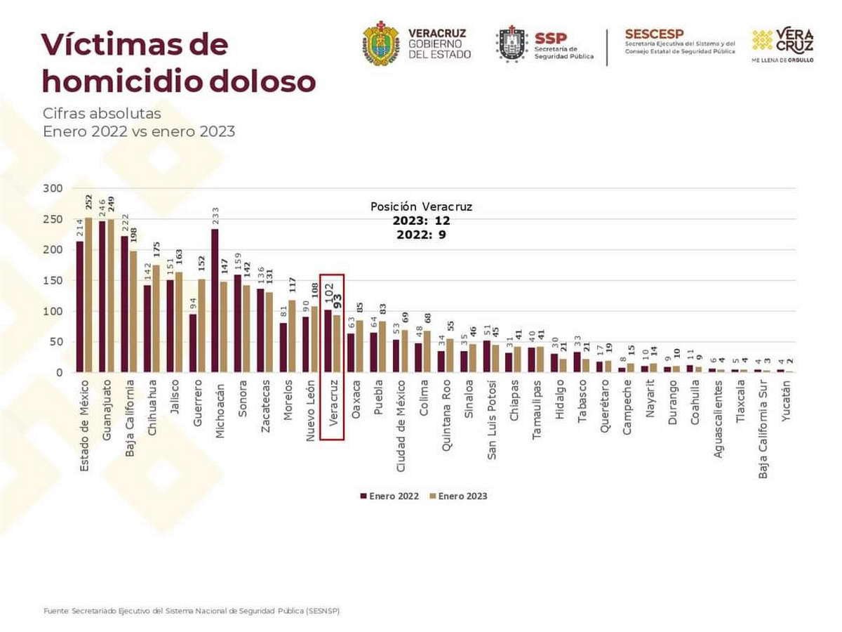 “En cuanto a delitos como homicidios dolosos, correspondientes al fuero común, Veracruz registra una reducción importante al pasar del lugar 12, en enero de 2022, al noveno en el inicio de este año”, citó.