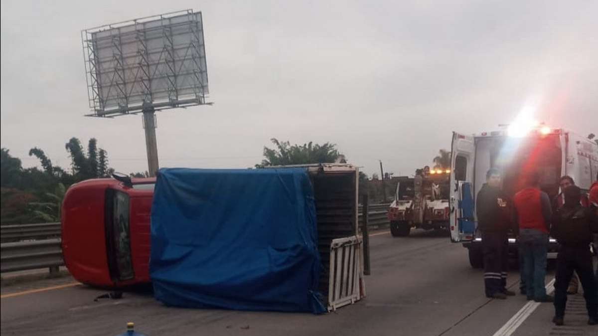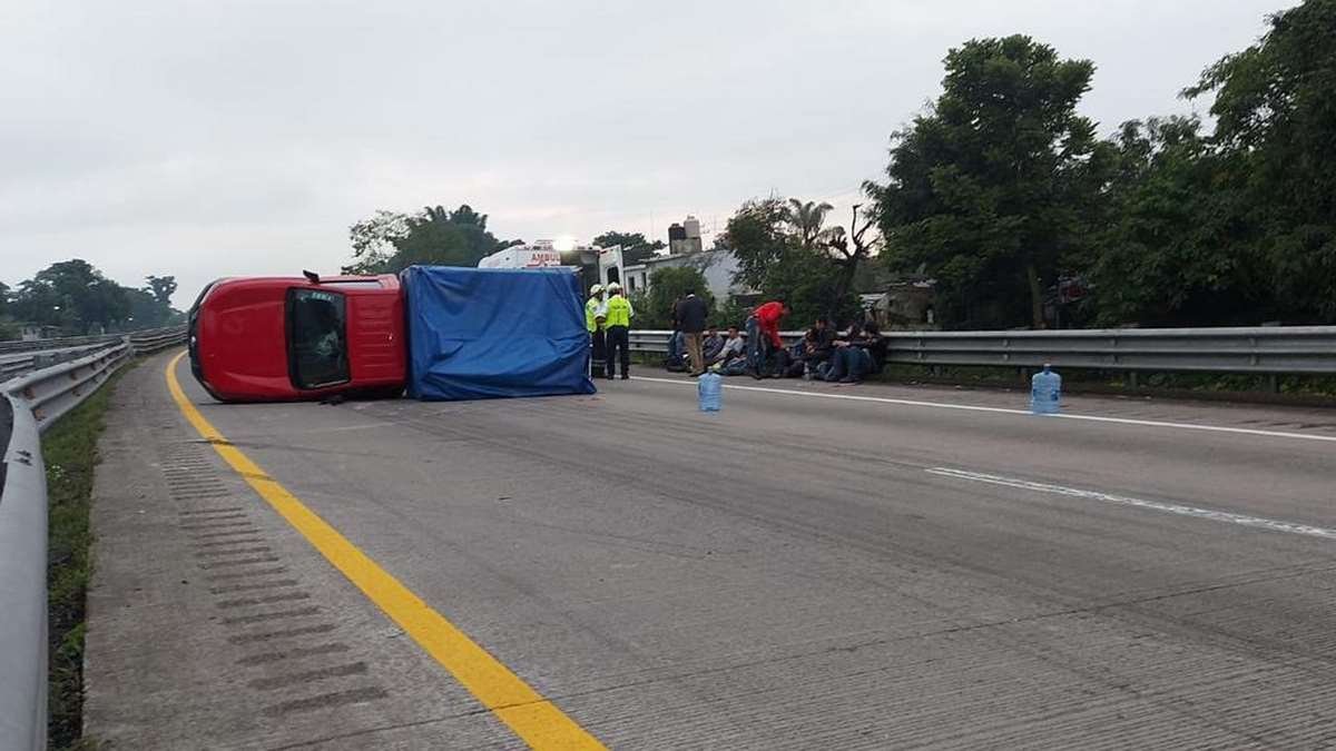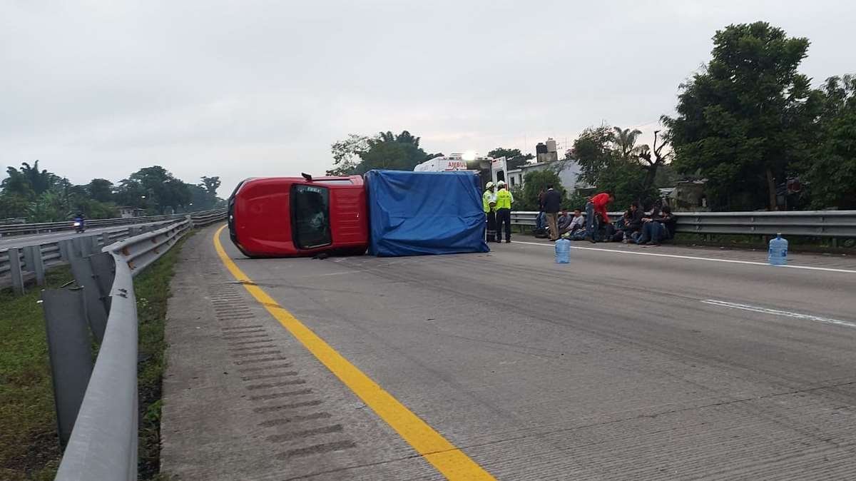 Ixtaczoquitlán, Ver.- Una camioneta pick up donde viajaban 12 personas, volcó hace unos minutos debido a que el conductor perdió el control al momento de circular sobre el kilómetro 283 de la autopista Orizaba-Córdoba a la altura de la comunidad de Sumider.