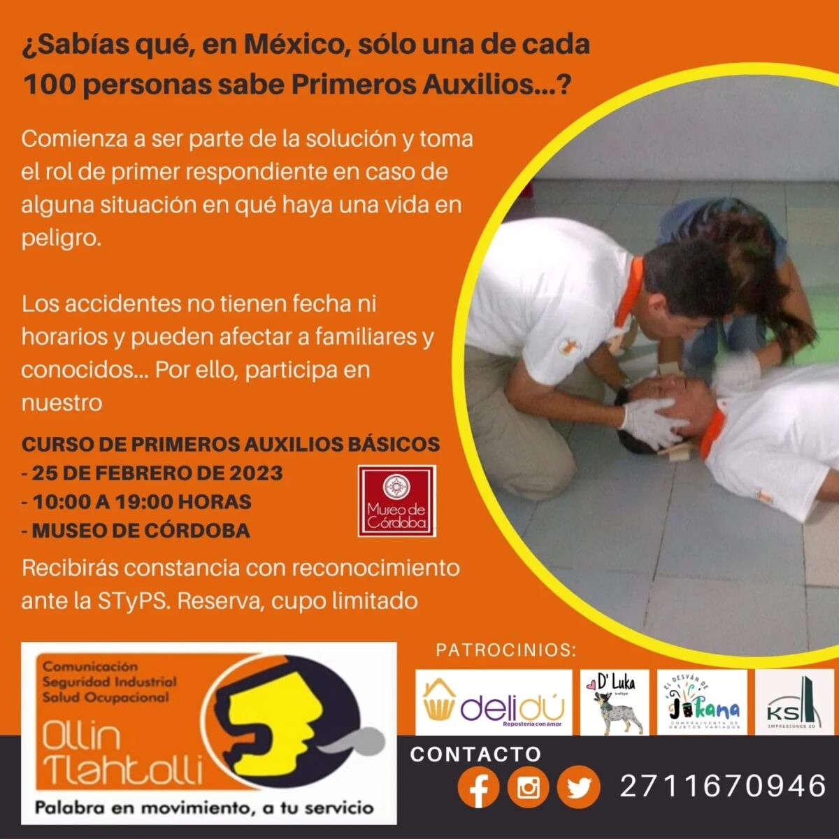 De no ser así, tienes a tiempo el curso presencial de #PrimerosAuxilios que Ollin Tlahtolli Consultores dará el sábado 25 de febrero de 2023 en el Museo de #CórdobaVer.