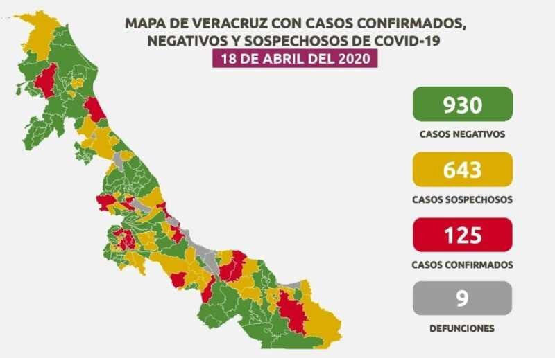 El número de positivos es de 125 en 30 municipios (55 mujeres y 70 hombres de entre 6 y 87 años de edad): Veracruz 48, Boca del Río 20, Coatzacoalcos 10, Poza Rica 8, Xalapa 5, Alvarado y Córdoba 3, Amatlán de los Reyes, Emiliano Zapata, Martínez de la Torre, San Andrés Tuxtla y Tlacotalpan con 2; Amatitlán, La Antigua, Coatepec, Coscomatepec, Fortín, Ixhuatlán del Café, Ixtaczoquitlán, José Azueta, Medellín, Minatitlán, Orizaba, Perote, Río Blanco, Santiago Tuxtla, Tantoyuca, Tres Valles, Tuxpan y Úrsulo Galván, 1.